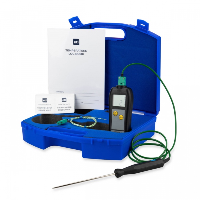 Budget cateringtermometersats levereras i en användbar ABS-bärväska med en temperaturloggbok, en låda med 100 engångssonddukar och ett spårbart kalibreringscertifikat. Denna termometer- och sondsats är utformad för livsmedels- och cateringindustrin.