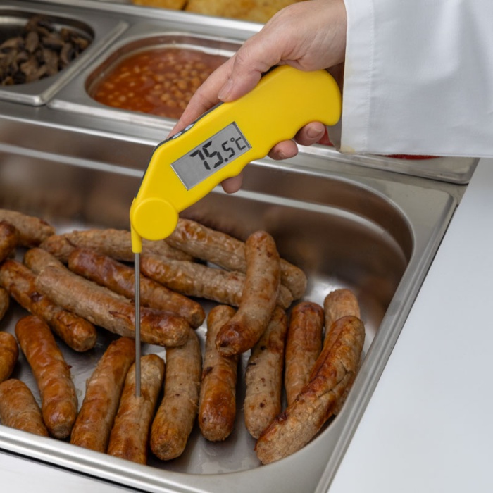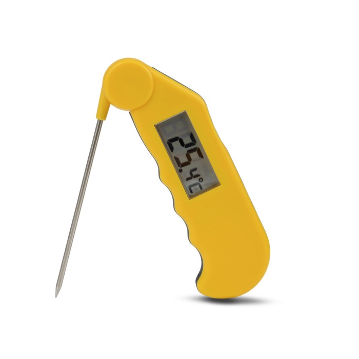 Den vattentåliga Gourmet hopfällbara sondtermometern är en lättanvänd mattermometer, idealisk för övervakning av matlagning, kylning och livsmedelstemperaturer som en del av HACCP- och hälso- och säkerhetsförfaranden. Enheten mäter temperaturen i intervallet -39,9 till 149,9 °C med en upplösning på 0,1 °C/°F och har två tryckknappsbrytare, på/av och håll inne.