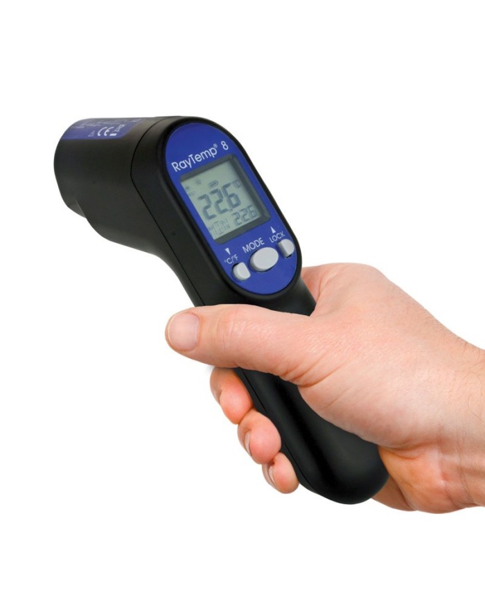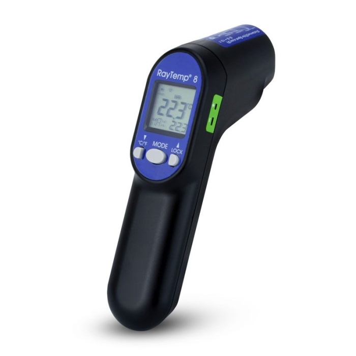 RayTemp 8 infraröd termometer är kompakt, pistolformad, lätt och enkel att använda. Sikta helt enkelt, tryck på knappen och visa temperaturen på objektet som mäts. LCD-displayen ger en digital avläsning av temperaturen över intervallet -60 till 500 °C. Denna infraröda termometer innehåller en tydlig, lättläst LCD-display med indikering av låg batterinivå. RayTemp 8 infraröd termometer har en automatisk avstängningsfunktion som stänger av instrumentet efter 60 sekunder, vilket maximerar batteriets livslängd. Den infraröda termometern har en laserpunktsinriktning för enkel användning.