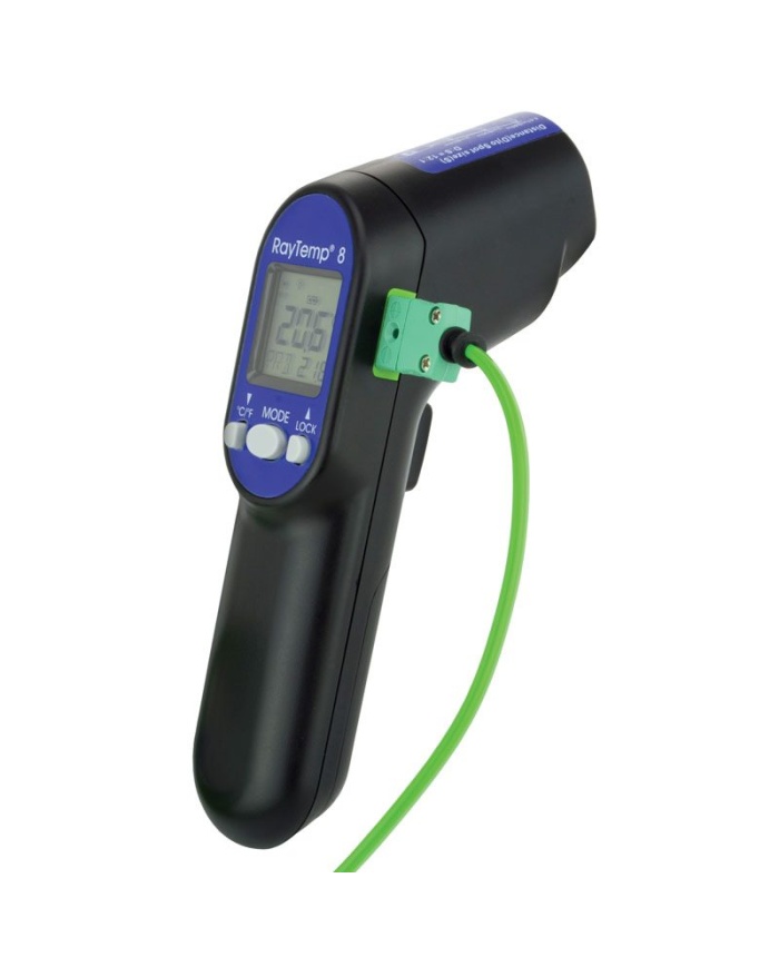 RayTemp 8 har en knappsats med fyra knappar, så att användaren kan välja °C/°F och max/min. Dessutom kan skillnaden mellan den maximala och minimala temperaturen och medeltemperaturen visas. Två instrument i ett. RayTemp 8 infraröd termometer innehåller ett miniatyrtermoelement typ K sonduttag som gör det möjligt att använda ett brett spektrum av typ K termoelementprober för en mängd olika temperaturmätningstillämpningar, inklusive luft-, vätske- och yttemperaturer. För information om kompatibla termoelementprober av typ K, vänligen klicka här.