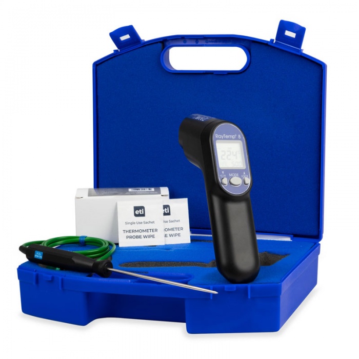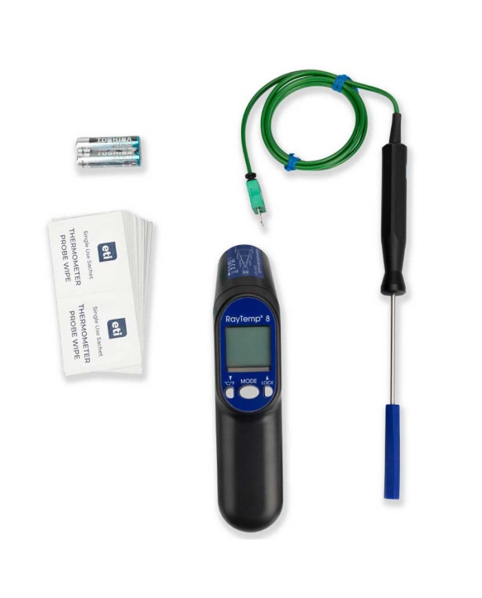 Infraröd termometersats som innehåller RayTemp 8 infraröd termometer tillsammans med en penetreringssond och våtservetter. Varje RayTemp-termometersats levereras i en användbar ABS-bärväska med en kartong med 100 antibakteriella sondservetter. Varje infraröd termometersats innehåller: