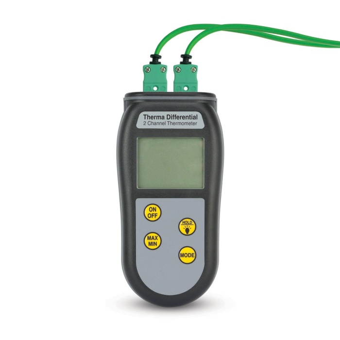 Den digitala termometern Therma Differential är en idealisk HVAC-termometer eftersom den gör det möjligt för användaren att använda två typ K-termoelementprober samtidigt. Displayen kan växlas för att visa sond T1 eller T2 temperatur eller skillnaden mellan sond T1 och T2 (T1-T2). Detta gör det till exempel möjligt att mäta temperaturfallet över radiatorer eller temperaturhöjningen eller -fallet för två objekt.