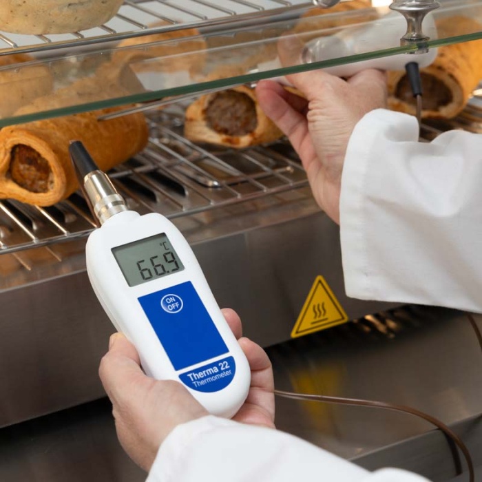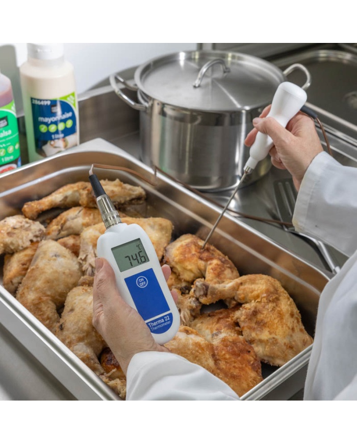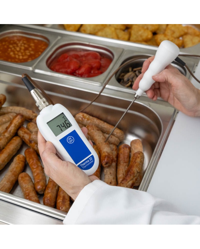 Termistorsensorn ger större noggrannhet för livsmedelsbearbetning, medan typ T-termoelementssensorn förlänger mätområdet och ger snabbare respons vid behov. Anslut helt enkelt sonden efter eget val till Therma 22 och termometern kommer att ta snabba, exakta mätningar.