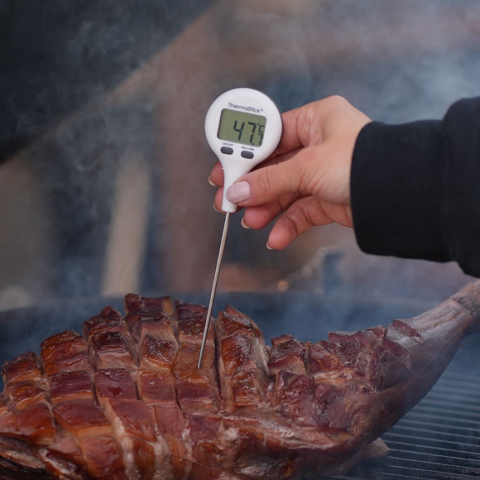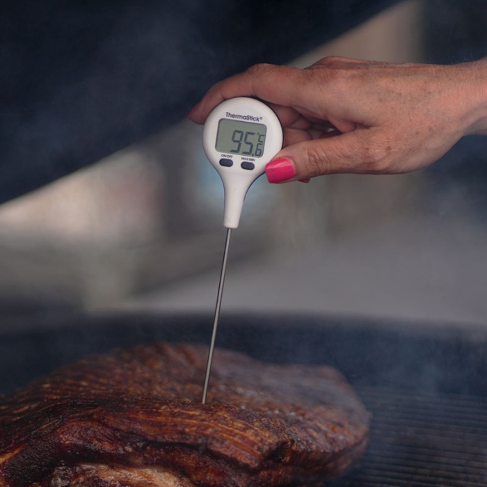 ThermaStick-termometern mäter temperaturen i intervallet -49,9 till 299,9 °C med en upplösning på 0,1 °C/°F och har två lättanvända tryckknappar, på/av och max/min.
