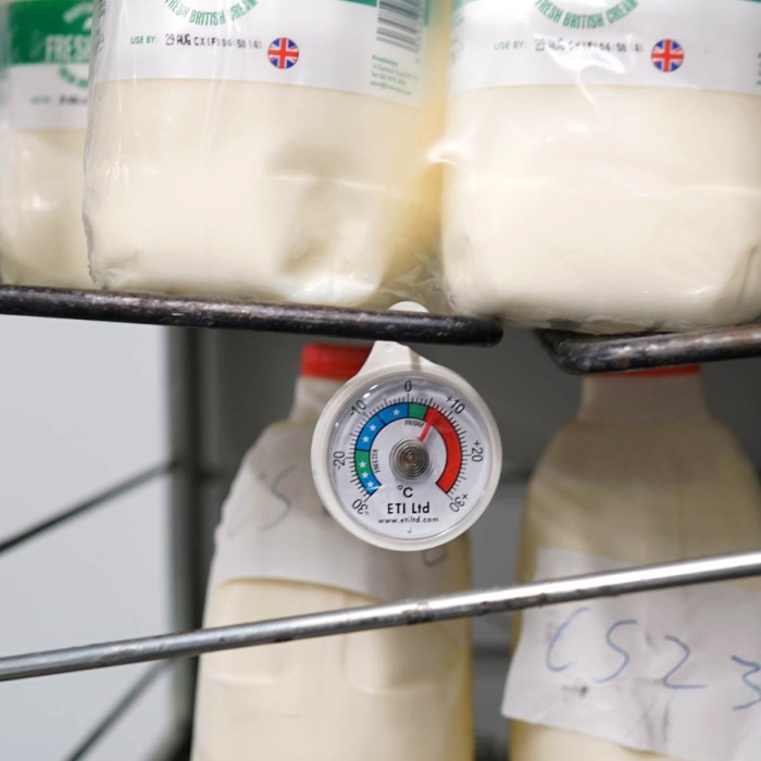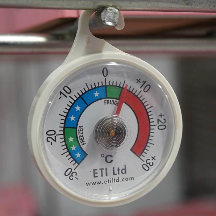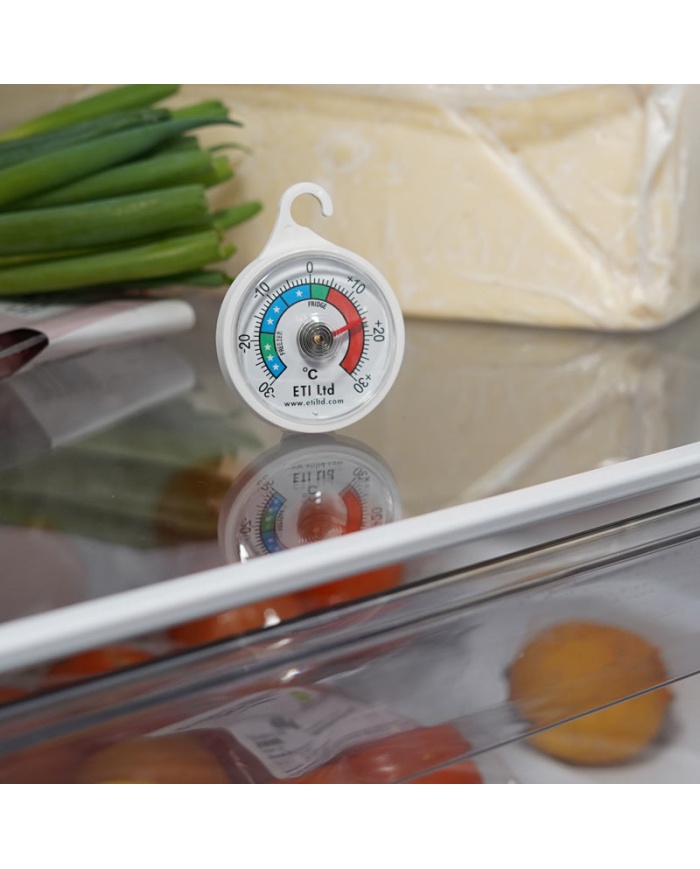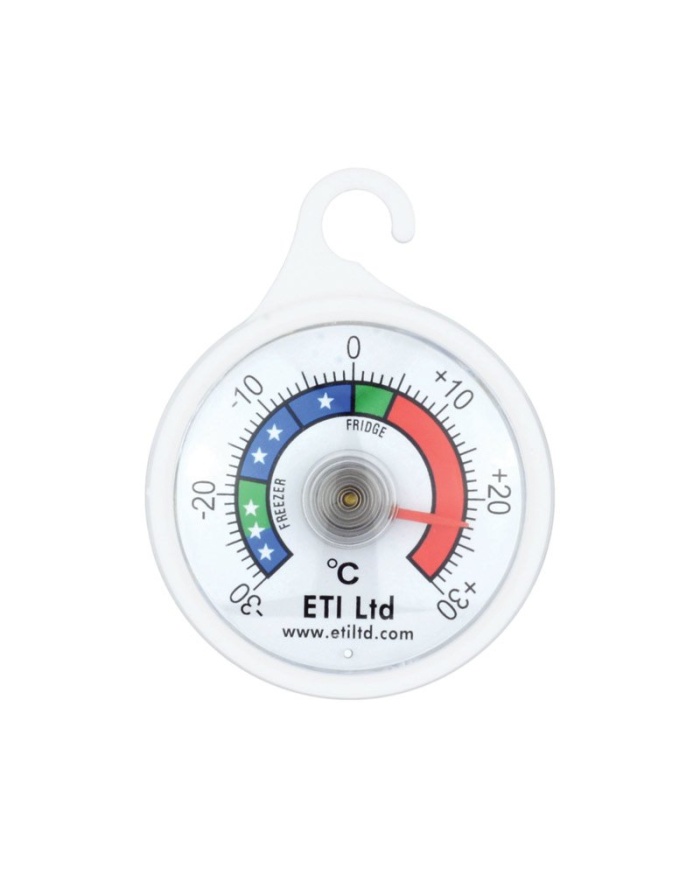 Denna lättlästa kyl- eller frystermometer har en cirkulär design med en urtavla med en diameter på 52 mm. Denna kyl-/frystermometer indikerar temperatur över intervallet -30 till 30 °C i 1 °C  divisioner. Den innehåller färgkodade zoner för enkel läsning och är inrymd i ett ABS-fodral som innehåller en plastkrok att hänga från en hylla.
